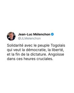 Pour rappel, Jean-Luc Mélenchon est un homme politique français engagé, fondateur du mouvement La France Insoumise. Il a également été sénateur, député et plusieurs fois candidat à la magistrature suprême en France. Sa prise de position sur la situation togolaise s’inscrit dans le cadre de défense des droits humains et des principes démocratiques à travers le monde.