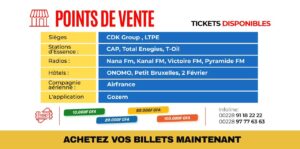 La billetterie est ouverte depuis le mercredi 7 janvier 2026. Les tickets sont proposés à 10 000, 20 000, 50 000 et 100 000 F CFA. Ils sont disponibles au siège de CDK Group, à la LTPE, dans les stations-service CAP, TotalEnergies et T-Oil, ainsi que dans plusieurs médias partenaires, hôtels de la place et auprès d’Air France.