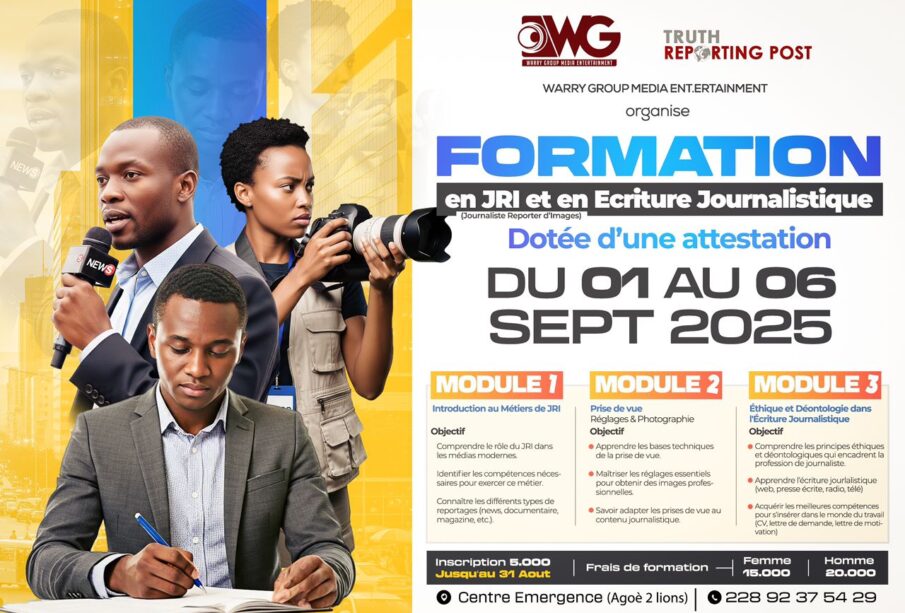À Lomé, une nouvelle opportunité de perfectionnement s’ouvre pour les passionnés des médias. Du 1er au 6 septembre 2025, Warry Group Media, en partenariat avec Truth Reporting Post, organise une session de formation en Journalisme Reporter d’Images (JRI) et en Écriture journalistique. Le rendez-vous est fixé au Centre Émergence, à Agoè 2 Lions.